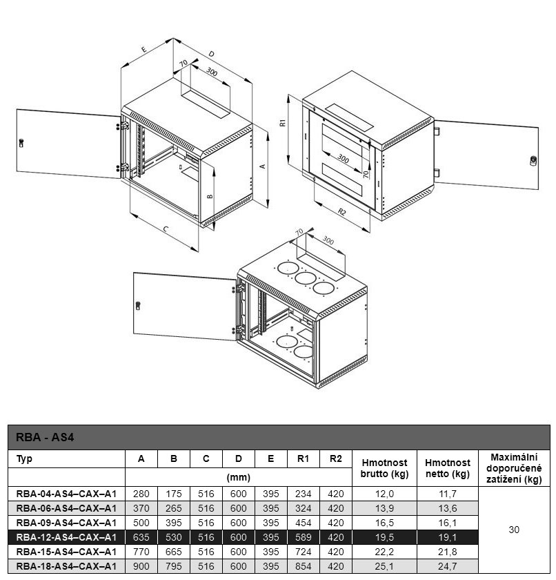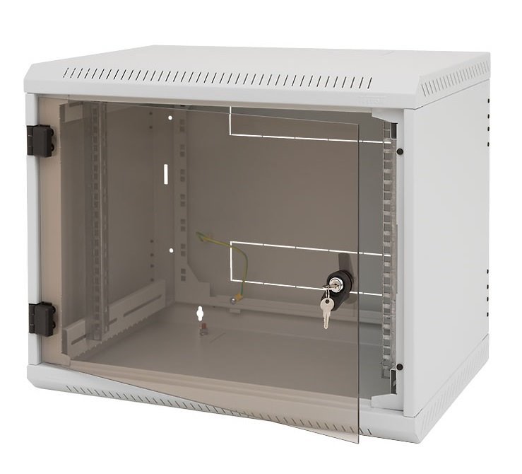Jednodílný nástěnný rozvaděč s krytím IP20, nosnost při správném zavěšení 80 kg. Dveře celoskleněné s bezpečnostním tvrzeným sklem 4 mm, robustní svařovaná konstrukce. Tento typ má šest vylamovacích záslepek pro montáž chladicích jednotek nebo ventilátorů. Součástí rozvaděče jsou dvě posuvné vertikální lišty.