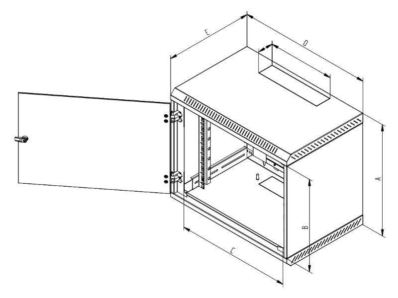 Jednodílný nástěnný rozvaděč s krytím IP20, nosnost při správném zavěšení 100 kg. Dveře jsou vyrobeny ze síta s prostupností 80 %., robustní svařovaná konstrukce. Součástí rozvaděče jsou dvě posuvné vertikální lišty.