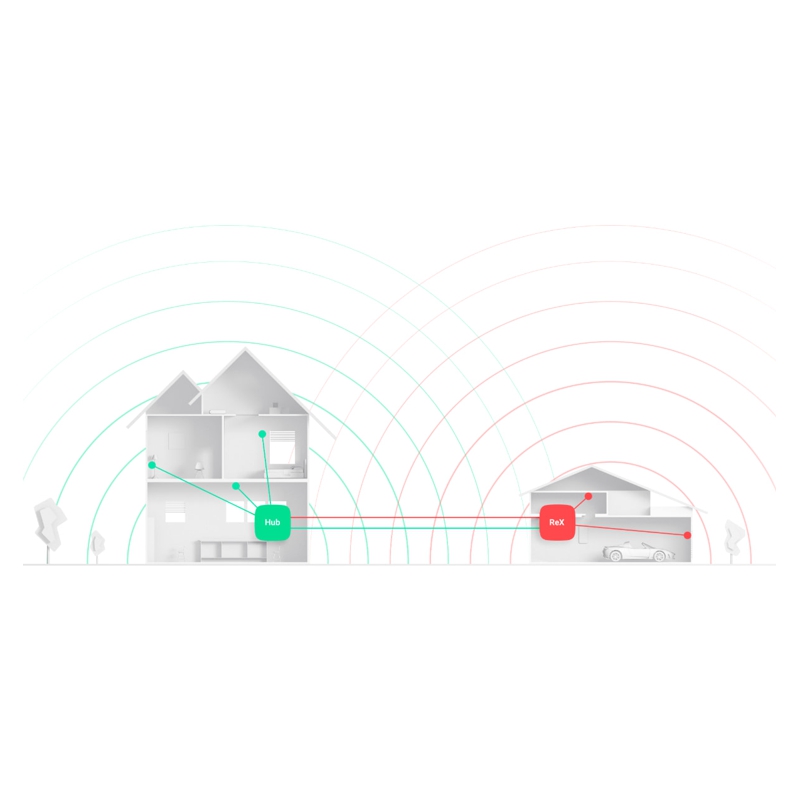 ReX 2 12 V s 12 V zdrojem je rozšiřovač dosahu rádiového signálu, který zprostředkovává komunikaci mezi centrálním ovládacím panelem a připojenými zařízeními, a díky tomu je umožňuje umístit téměř ve dvojnásobné vzdálenosti od sebe. S jeho pomocí je tak možné systémem Ajax zabezpečit několikapodlažní budovy a další rozsáhlé objekty. Použití 5 těchto zařízení rozšiřuje pokrytí rádiového signálu až na 35 km2.