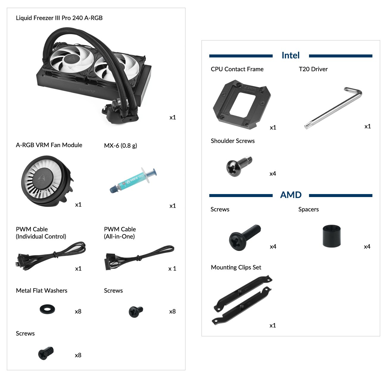 Vodní chladič určený pro chlazení procesoru. Vyznačuje se vysokou kvalitou, výkonem a spolehlivostí. Vybaven je dvěma 120mm ventilátory ARCTIC P12 Pro A-RGB, které disponují kvalitními FDB ložisky zajišťujícími dlouhotrvající bezproblémový chod. Odolné opletené hadice jsou dlouhé 450 mm a díky dostatečně širokému průměru zaručují plynulý průtok chladicí kapaliny.