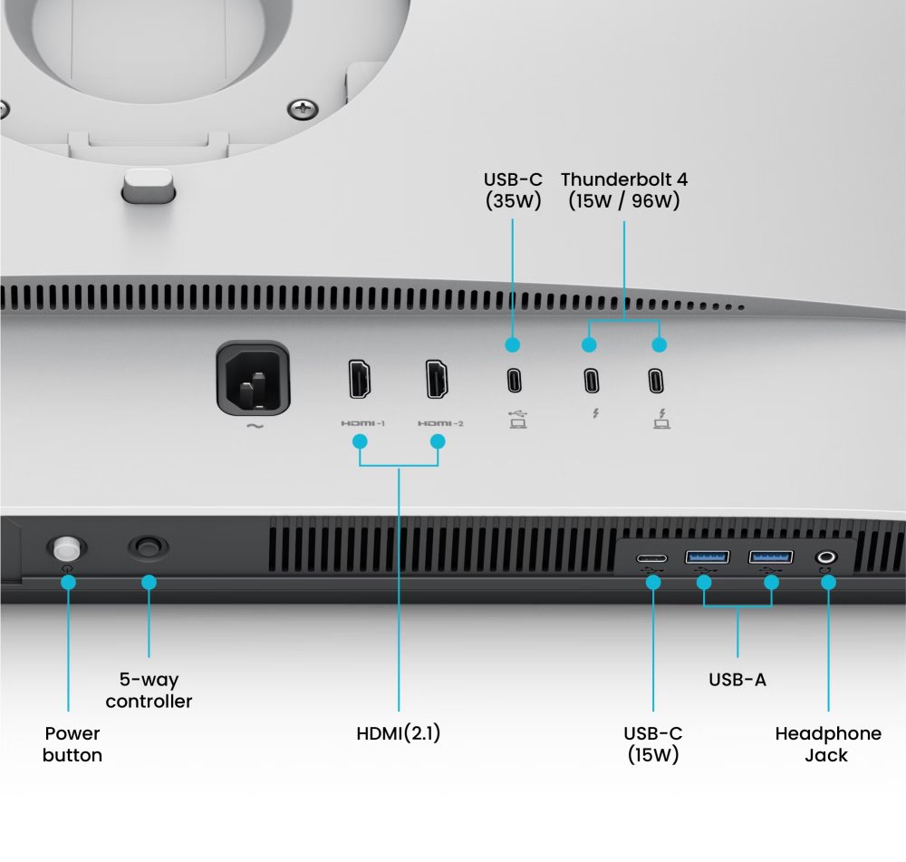 Monitor nabízí 2× HDMI 2.1, Thunderbolt 4 se vstupem i výstupem a USB-C s DisplayPort Alt Mode. Thunderbolt 4 port poskytuje Power Delivery až 96 W pro napájení připojeného MacBooku, zatímco USB-C port nabízí 35 W napájení. Výstupní Thunderbolt 4 port s 15 W umožňuje řetězové propojení dalšího monitoru.