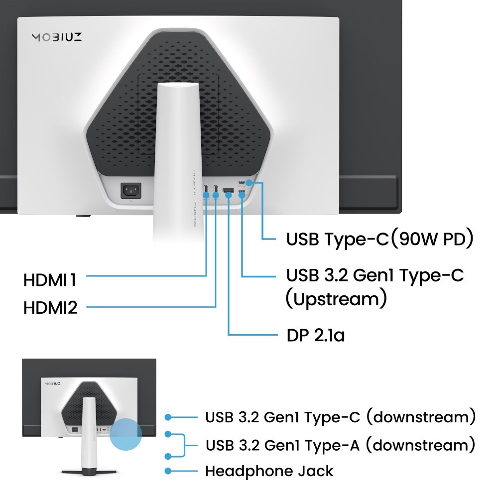 Stojan umožňuje náklon -5° až +15°, otáčení ±15° a nastavení výšky o 100 mm. Monitor je vybaven VESA držákem 100 × 100 mm. Konektivita zahrnuje DisplayPort 2.1, 2× HDMI 2.1 (jeden s eARC), USB-C s Power Delivery 90 W a DisplayPort Alt Mode, USB hub s 2× USB-A a 1× USB-C porty.