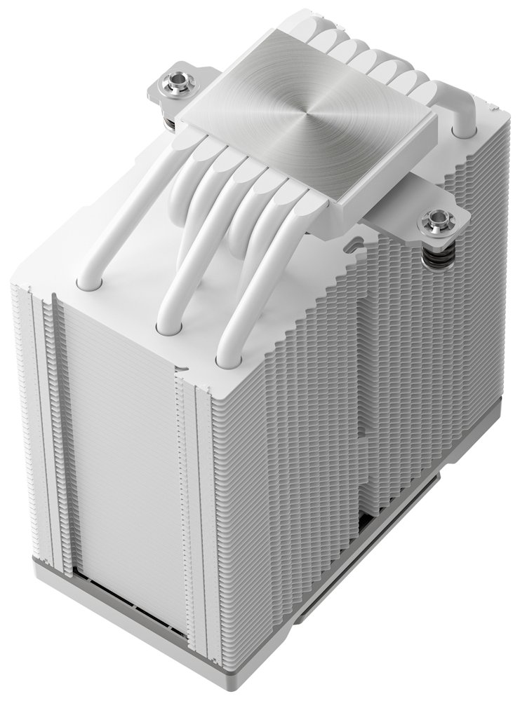 Věžový chladič s maticovým uspořádáním lamel o rozměrech 151 × 124 × 76 mm poskytuje velkou chladicí plochu při zachování kompaktních rozměrů. Precizně obráběná měděná základna zajišťuje rovnoměrný přenos tepla na všech sedm tepelných trubic. Celková hmotnost chladiče činí 1252 g.