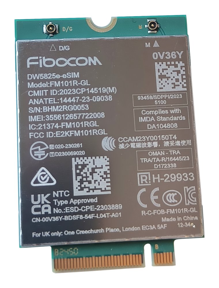Modul podporuje klasickou SIM kartu přes externí slot i eSIM s režimem Dual SIM (dostupnost eSIM závisí na regionu a požadavcích operátora). K dispozici jsou pokročilé funkce jako Radio On/Off pro vypnutí rádiového vysílání a Wake on Wireless pro probuzení systému při příchozím datovém přenosu.
