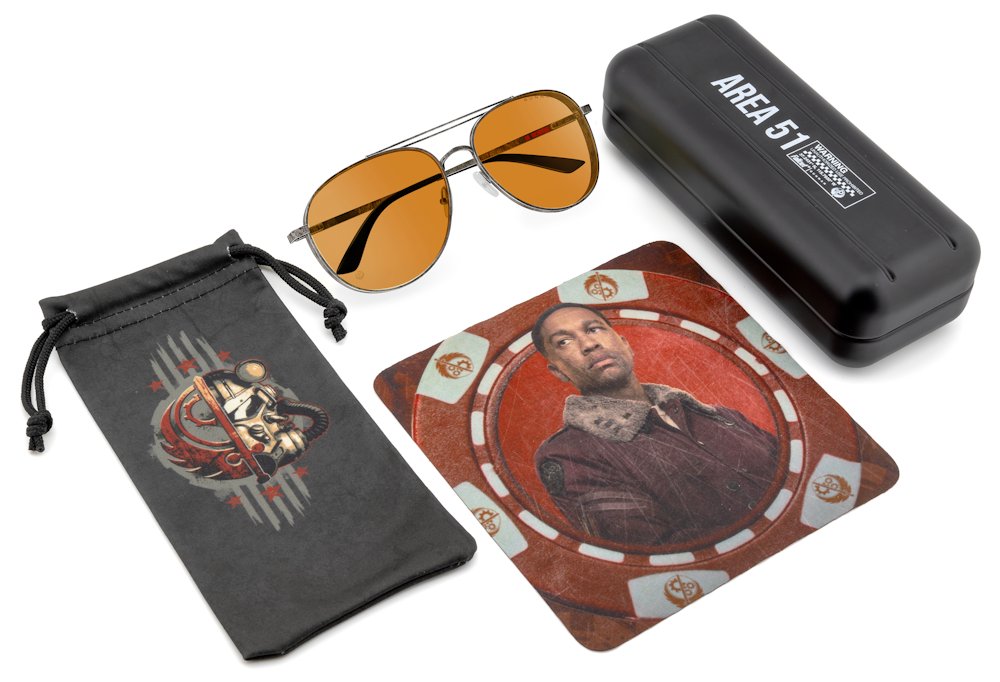 Každé brýle jsou dodávány s kolekcí exkluzivního příslušenství včetně kovového pouzdra „Area 51“, mikrovláknového pouzdra s motivy Brotherhood a čisticího hadříku s designem Fallout.