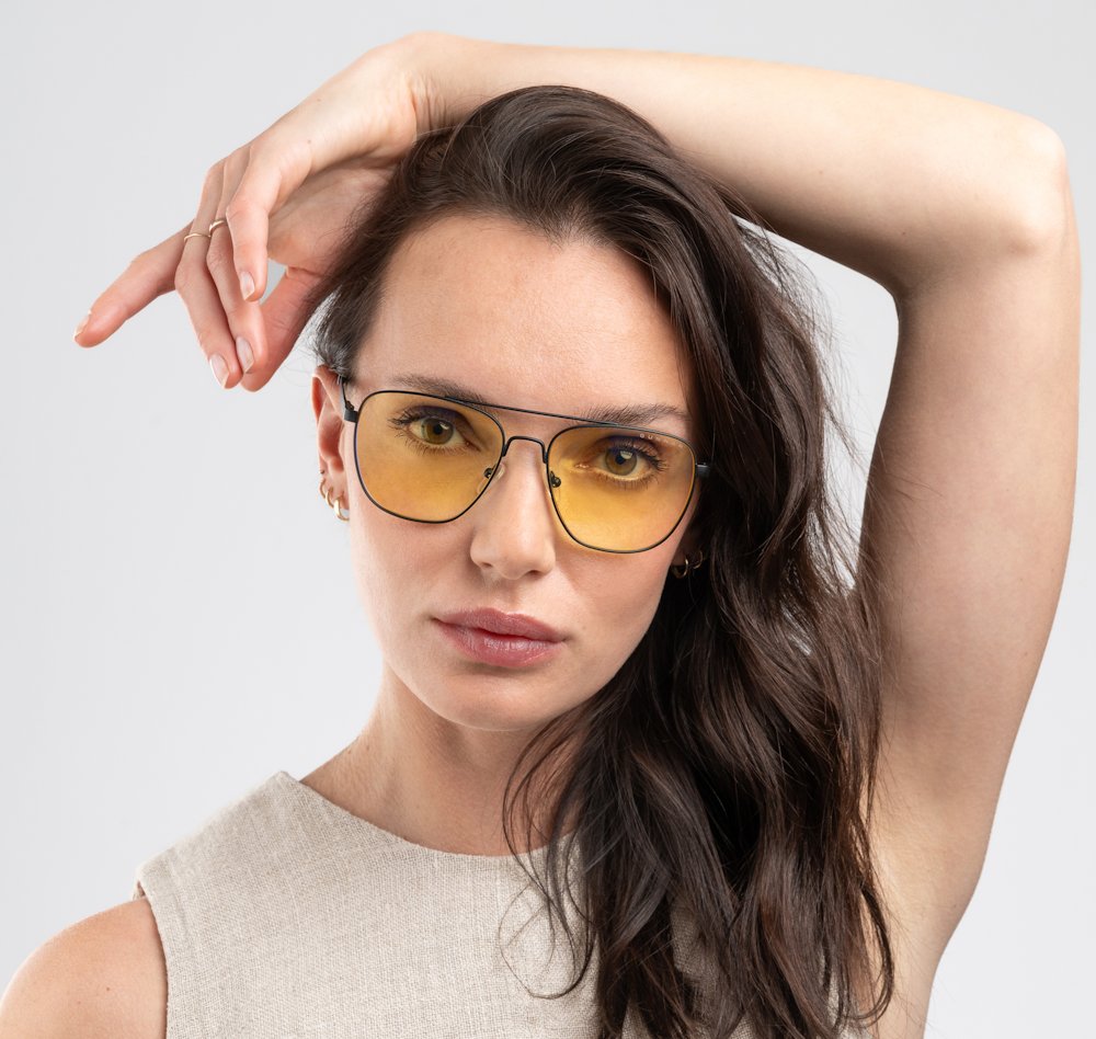 Kancelářské brýle s čirými skly a jedinečným designem, určené zejména pro venkovní nošení či práci na počítači ve velmi světlém prostředí. Blokují 35 % modrého světla a 100 % ultrafialového záření, díky čemu minimalizují zatížení očí a celkovou únavu. Odolná nerezová ocel zajišťuje lehké, ale přesto pevné nošení.