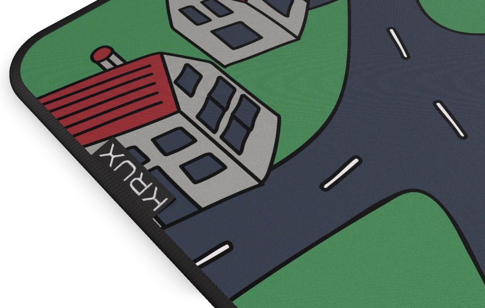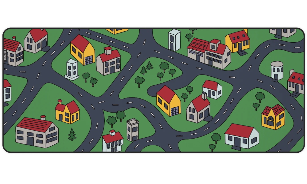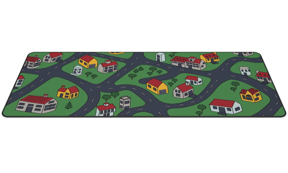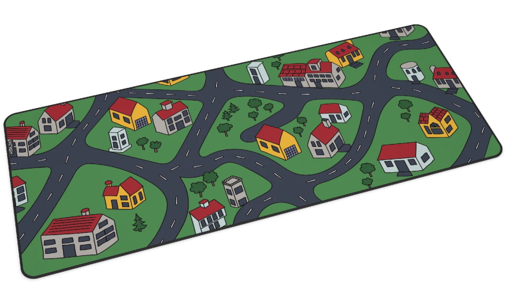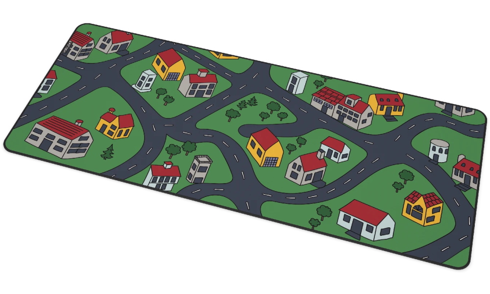 Velkoformátová podložka pod myš s nostalgickým designem inspirovaným dětskými koberci s motivem ulic a silnic.