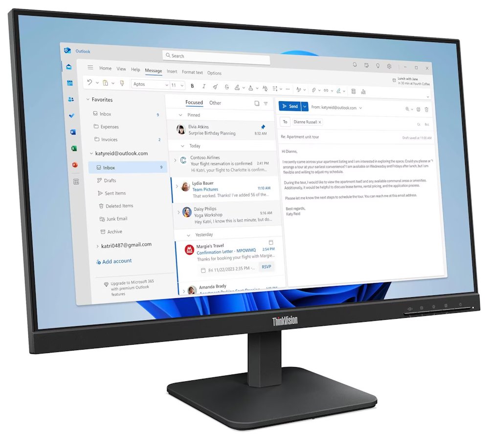 Plná podpora operačních systémů Windows 7, 10 a 11. V balení je dodáván HDMI kabel pro okamžité připojení. Monitor podporuje připojení ThinkCentre M Series v provedení Tiny a Nano.
