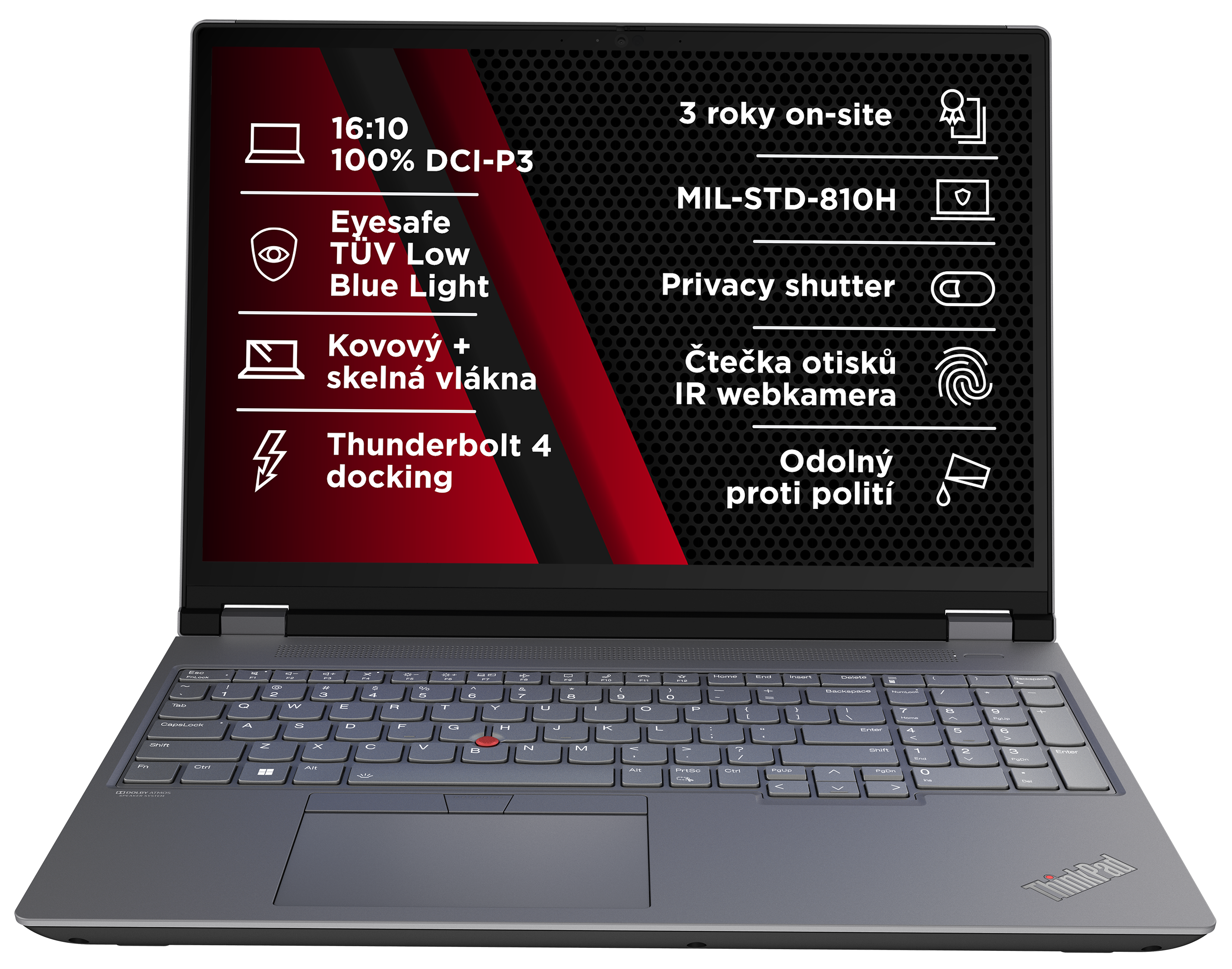 Lenovo ThinkPad P16 Gen 2 Operační systém: Windows® 11 Pro Procesor: Procesor: Intel Core i7-14700HX (20 jader (8P + 12E), 28 vláken, P-core 2.1/5.5 GHz, E-core 1.5/3.9 GHz, 33 MB cache) Paměť:2x 16GB SO-DIMM DDR5-5600 Non-ECC Počet slotů (celkem/volných): (4/2) Maximální velikost: 192GB (4x 48GB DDR5 SO-DIMM) Pevný disk: 1T GB SSD M.2 2280 PCIe® 4.0x4 Performance NVMe® Opal 2.0 Sloty pevného disku: Dva sloty M.2 2280 PCIe® 4.0 x4 Optická mechanika: ne Čtečka paměťových karet: čtečka SD karet 7.0 Displej: 16" WQXGA (2560x1600) IPS 500nits Anti-glare, 100% sRGB, 165Hz, Eyesafe® Grafická karta: NVIDIA® RTX 2000 Ada Generation 8GB GDDR6 Audio: kodek Realtek® ALC3306; Stereo reproduktory, 2W x2, Dolby® Atmos®; mikrofon 2x, pole Web kamera: FHD 1080p s privátní krytkou Polohovací zařízení: TouchPad + TrackPoint Podsvícená klávesnice: ano Numerická klávesnice: ano Čtečka otisků prstů: ano Síť: ne Bezdrátová komunikace: WLAN + Bluetooth (Intel® Wi-Fi® 6E AX211, 11ax 2x2 + BT5.3) Konektory USB: * 1x USB-A (USB 5Gbps / USB 3.2 Gen 1) * 1x USB-A (USB 5Gbps / USB 3.2 Gen 1), Always On *1x USB-C® (USB 10Gbps / USB 3.2 Gen 2), with USB PD 3.0 * 2x Thunderbolt™ 4 / USB4® 40Gbps (support data transfer, Power Delivery 3.0 and DisplayPort™ 1.4) Další konektory: * 1x HDMI® 2.1, až 8K/60Hz * 1x čtečka SD karet 7.0 * 1x čtečka čipových karet * 1x Slot pro nano-SIM kartu * 1x kombinovaný konektor pro sluchátka / mikrofon (3,5 mm) Zabezpečení: Bezpečnostní čip diskrétní TPM 2.0 Enabled; Fyzický zámek Kensington® Nano Security Slot™, 2,5 x 6 mm Baterie: Integrovaná 94Wh Napájení: 170W Slim Tip (3-pin) Barva: šedá (Storm Grey), černá (Villi Black) Materiál: hliník Rozměry: 364 x 266 x 30,23 mm Hmotnost: cca 2,95 kg Záruka: 3 roky Odkaz na stránku výrobce: https://psref.lenovo.com/Detail/ThinkPad/ThinkPad_P16_Gen_2?M=21FA004SCK