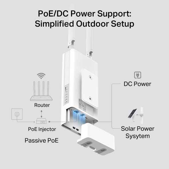Modem můžete napájet jak pasivně přes PoE (standard IEEE 802.3af/802.3at), tak pomocí DC adaptéru (12 V, 1 A). To vám zjednodušuje připojení ve venkovním prostředí.