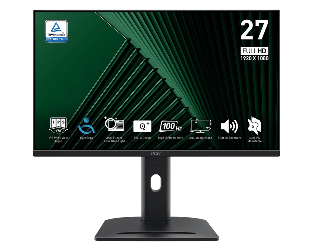 MSI Eye Care Technology *KENSINGTON LOCK *Adaptive-Sync * Ergonomic Design *MSI EyesErgo technology with Anti-Flicker and Less Blue Light technology Typ obrazovky: IPS Úhlopříčka [palce]: 27" Rozlišení: 1920 x 1080 (FHD) Rozteč bodu [mm]: 0.3114 Obnovovací frekvence [Hz]: 100 Hz Poměr stran: 16:9 Povrch displeje: Anti-glare Jas [cd/m2]: 300 Kontrast: 1000:1 Odezva [ms]: 1 ms (MPRT) / 4 ms (GtG) Pozorovací úhly (Horizontál/Vertikál): 178°(H) / 178°(V) Počet barev: 16.7 M Reproduktory: 2 x 2W Konektory: VIDEO PORTS: *1x HDMI™ 1.4b (FHD@100Hz) *1x DisplayPort 1.2a *1x D-Sub (VGA) AUDIO PORTS: *1x Headphone-out *1x Line-in Napájení: Internal Power Board, 100~240V, 50~60Hz Montáž na zeď: 100 x 100 mm Naklápění monitoru: * ADJUSTMENT (TILT): -5° ~ 20° *ADJUSTMENT (SWIVEL): -45° ~ 45° *ADJUSTMENT (PIVOT): -90° ~ 90° *ADJUSTMENT (HEIGHT): 0 ~ 130 mm Barva: Black Rozměry (ŠxVxH mm): 612.1 x 561.4 x 226.9 mm Hmotnost [kg]: 6.03 kg Záruka: 3 roky