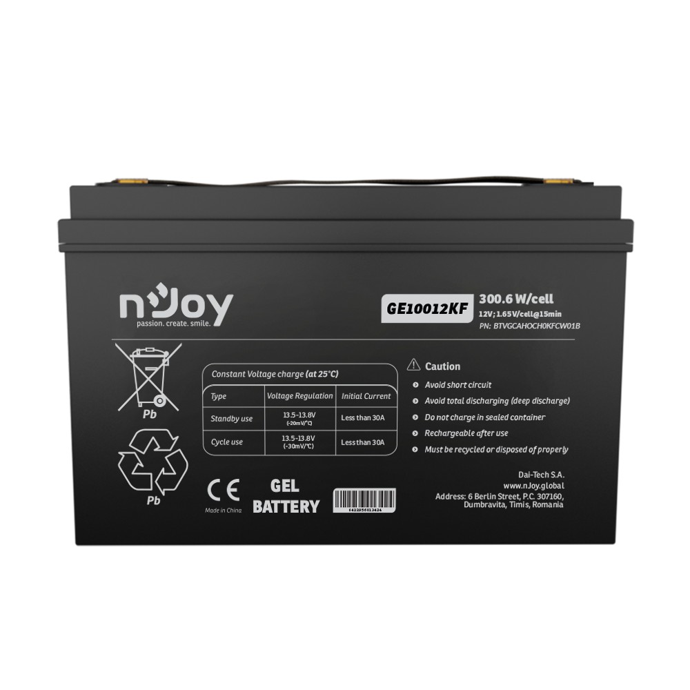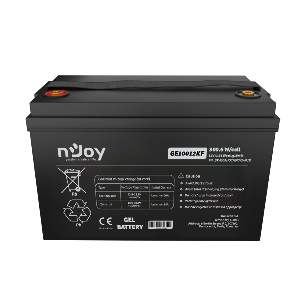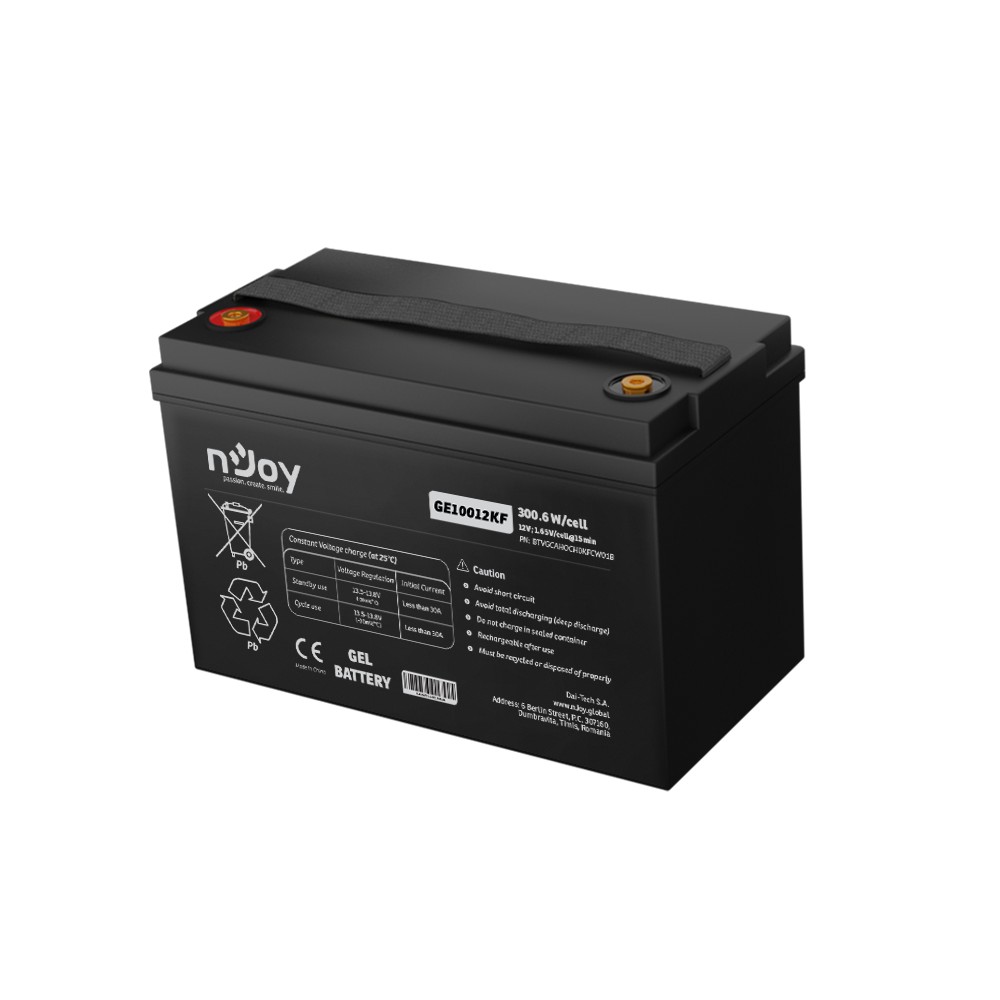 Baterie nJoy GE10012KF s kapacitou 100 Ah je vlajkovou lodí v segmentu gelových akumulátorů nJoy. Je navržena pro uživatele, kteří nehledají kompromisy a potřebují zajistit energii pro své systémy po dobu mnoha hodin až dní. Díky gelové technologii (Gel Deep Cycle) nabízí vynikající stabilitu a odolnost i při náročném cyklickém provozu.