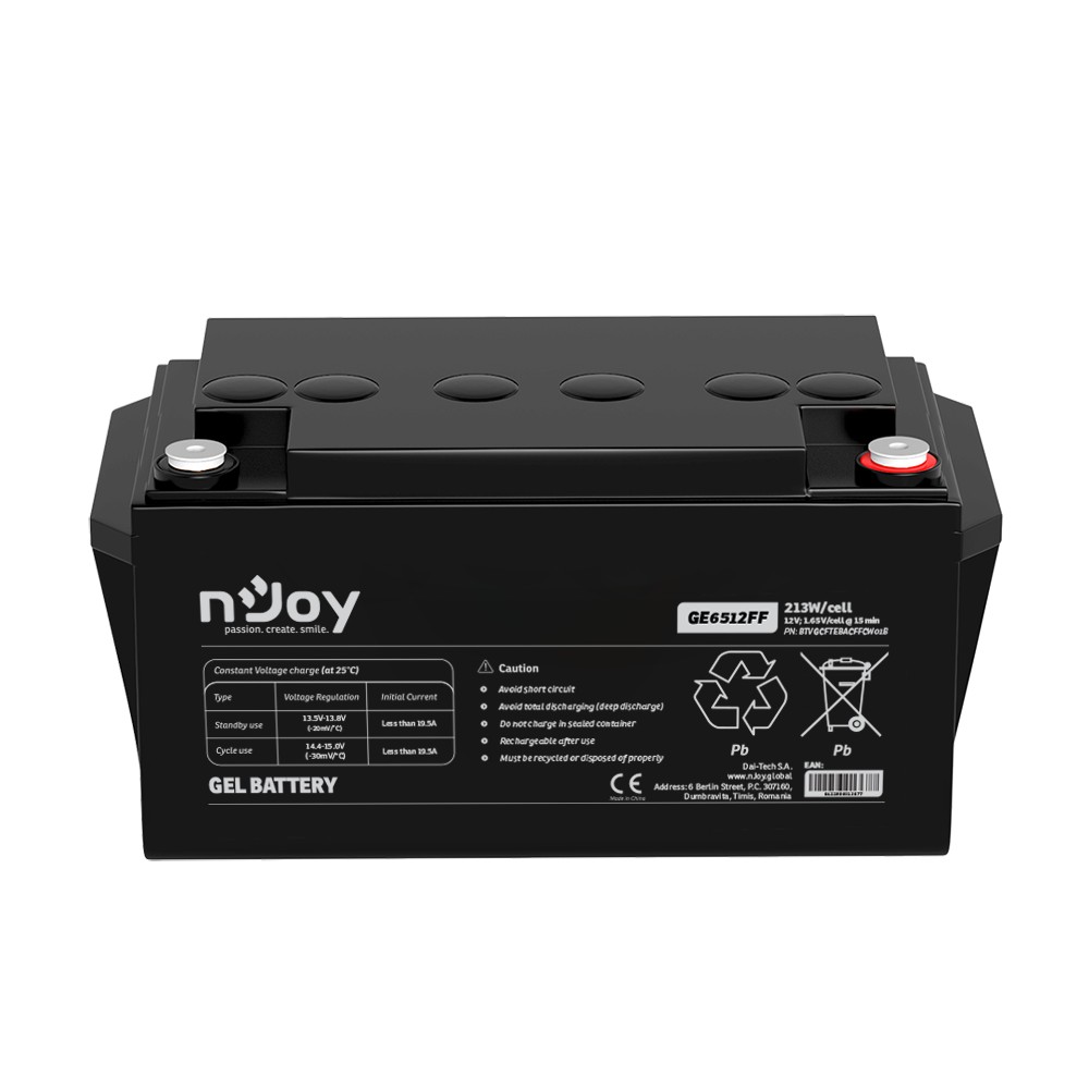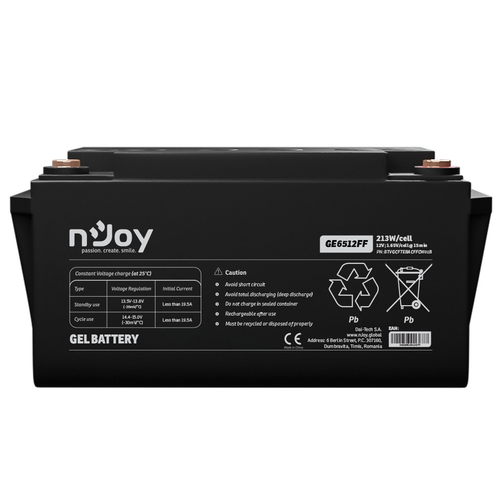 Baterie nJoy GE6512FF (12V / 65Ah) je vysoce výkonný akumulátor využívající pokročilou technologii gelového elektrolytu (Gel Deep Cycle). Je navržena pro náročné aplikace, kde je vyžadována maximální spolehlivost, hluboké vybíjení a dlouhá životnost. Tato baterie je ideálním partnerem pro záložní zdroje řady nJoy Aira, solární systémy nebo telekomunikační zařízení.