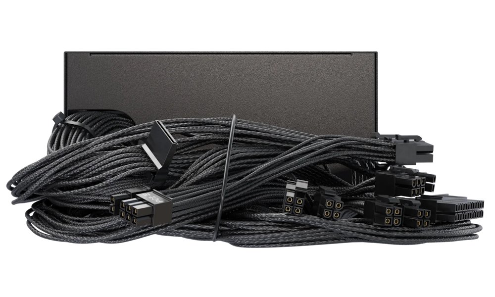 Konektory: 24-pin ATX, 2× CPU, PCIe 8/6-pin, 12V-2×6, 3× SATA/Molex