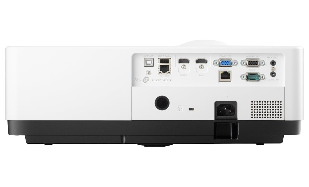 Projektor nabízí kompletní sadu vstupů včetně HDBaseT pro přenos obrazu, zvuku a ovládání jedním kabelem na vzdálenost až 100 m. Port RJ-45 umožňuje integraci do firemní sítě pro centralizovanou správu. K dispozici jsou také klasické vstupy: VGA, audio vstup a výstup (3,5 mm) a výstup VGA pro průchozí obraz.