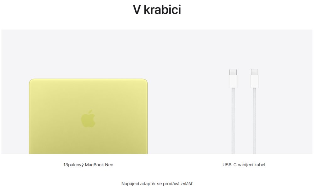 MacBook Neo, USB-C nabíjecí kabel (1,5 m). Napájecí adaptér se prodává zvlášť, minimální příkon pro nabíjení je 20 W.