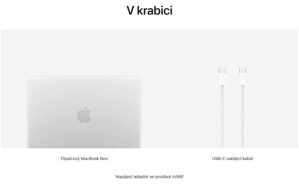 MacBook Neo, USB-C nabíjecí kabel (1,5 m). Napájecí adaptér se prodává zvlášť, minimální příkon pro nabíjení je 20 W.