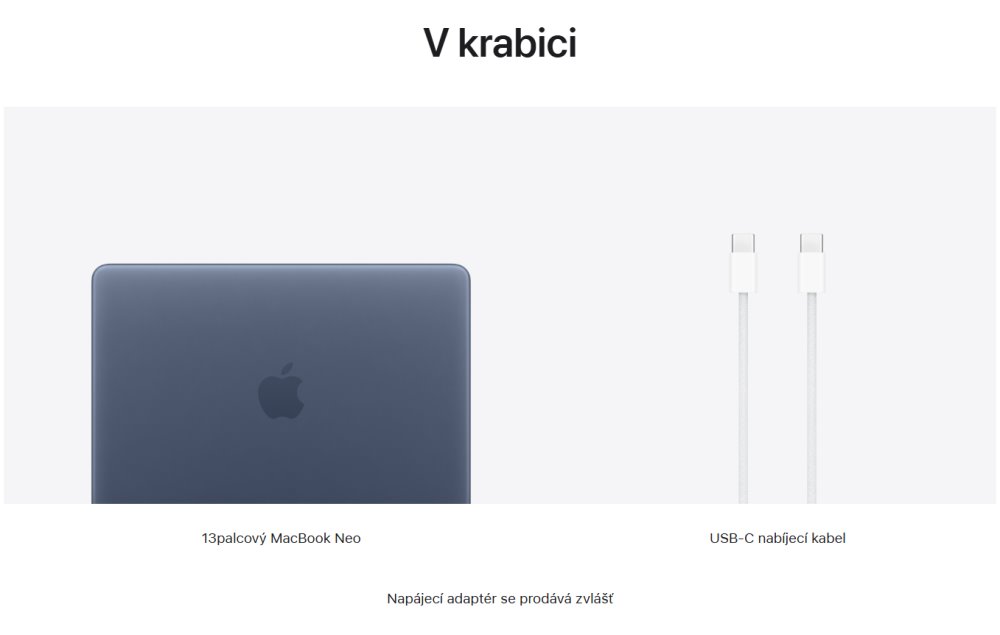 MacBook Neo, USB-C nabíjecí kabel (1,5 m). Napájecí adaptér se prodává zvlášť, minimální příkon pro nabíjení je 20 W.