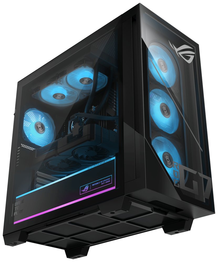 Systém čtyř ventilátorů zajišťuje optimální průtok vzduchu s minimálními překážkami. Vodní chladič se dvěma dodatečnými ventilátory odvádí horký vzduch horním panelem. Grafická karta ROG s patentovanými ventilátory Axial-tech a technologií 0dB při nízkém zatížení zajišťuje skutečně tichý provoz.