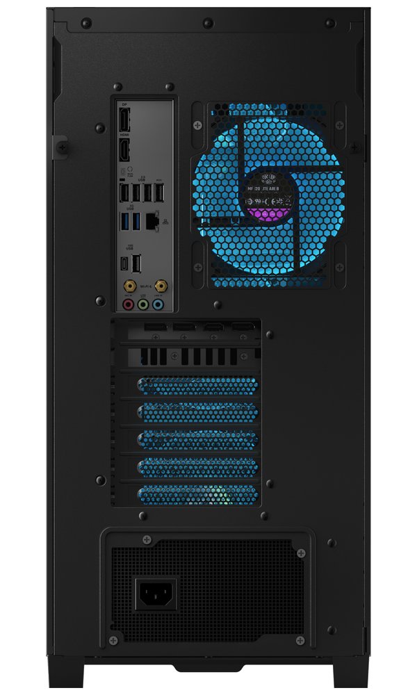 Porty zadní: 4× USB 2.0, 2× USB 3.2 Gen1, USB 3.2 Gen2, USB-C 3.2 Gen2, 3× DisplayPort (GPU NVIDIA), HDMI (GPU NVIDIA), RJ-45, 3× audio jack