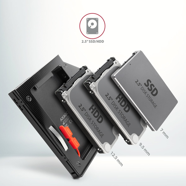 Interní rámeček AXAGON RSS-CD12 určený k montáži místo stávající CD/DVD mechaniky o výšce 12.7 mm. Je určen pro 2.5" SSD/HDD SATA disky. Snadno tak nahradíte optickou jednotku ve vašem notebooku pevným diskem. Rozhraní SATA 6G dovolí užívat si rychlost moderních SSD disků až 6Gb/s. Díky absenci složité elektroniky nezpomaluje rychlost přenosu dat a podporuje všechny moderní funkce např. TRIM. Tato redukce zajišťuje širokou kompatibilitu s různými značkami notebooků. ODD rámeček je možné nastavit pomocí dvojitého přepínače tak, že bude fungovat s většinou notebooků značek LENOVO, HP, DELL, ASUS, ACER, SONY, TOSHIBA a dalších. Do rámečku je možné použít standardní SSD disky výšky 7 mm i pevné disky výšky 9.5 a 12.5 mm o rozměru 2.5". ODD caddy s osazeným diskem se chová jako standardní pevný disk v operačním systému i v BIOSu (UEFI). Vložením disku do redukce snadno přidáte interní 2.5" disk, kterým lze doplnit stávající disk v notebooku. Díky podpoře bootování lze přidáním 2.5" SSD disku výrazně zrychlit starší notebook. Unikátní bezšroubkový systém uchycení disku je zajištěn pomocí gumové příchytky nebo pomocí gumových závitových vložek. Gumové vložky také pomáhají minimalizovat vibrace pevného disku. Kovové pružiny pomáhají fixovat adaptér v šachtě optické mechaniky. Kovové tělo rámečku je vyrobeno z hliníku a zajišťuje tak dokonalou mechanickou ochranu vloženého disku. Vestavěný HQ kondenzátor napomáhá stabilizovanému napájení SSD/HDD. Elegantní, vestavěná LED dioda indikuje vložení disku a přenos dat. Součástí balení je také plastové čelo (záslepka) imitující čelo optické CD/DVD mechaniky. Na zadní části redukce je několik montážních otvorů pro zajištění rámečku v těle notebooku. Vstup: • Rozhraní SATA, kompatibilní se SATA 6G (SATA III), SATA 3G (SATA II) a SATA 1.5G (SATA I), • 13 pinový (7+6) SLIM SATA datový a napájecí male konektor pro připojení do notebooku. Výstup: • Rozhraní SATA, kompatibilní se SATA 6G (SATA III), SATA 3G (SATA II) a SATA 1.5G (SATA I), • podpora 2.5" SSD/HDD, • max. kapacita disku - všechny bez omezení, • max. výška 2.5" disku - 12.5 mm, • standardní 22 pinový (7+15) SATA datový a napájecí female konektor pro 2.5" disky. Další vlastnosti: • Vyhovuje Serial ATA 3.1 specifikaci (SATA/600), přenosové rychlosti až 6 Gb/s (600 MB/s). • Vyhovuje Serial ATA 2.0 specifikaci (SATA/300), přenosové rychlosti až 3 Gb/s (300 MB/s). • Vyhovuje Serial ATA 1.0 specifikaci (SATA/150), přenosové rychlosti až 1.5 Gb/s (150 MB/s). • Celková rychlost je dána typem vloženého disku a verzí SATA rozhraní optické mechaniky notebooku. • Jde o čistě hardwarovou redukci, pro všechny operační systémy, žádné ovladače se neinstalují. • Podpora bootování z disku v interním adaptéru. • Plná podpora Plug and Play. • Adaptér je napájen pomocí 6-pinového napájecího Slim SATA konektoru. • Vestavěný HQ kondenzátor pro stabilizované napájení SSD/HDD. • Rozměry rámečku odpovídají slim 5.25" pozici v notebooku. • Hliníkové tělo pro ochranu disku a chlazení disku. Další údaje: • Rozměry adaptéru 128 x 127 x 12.7 mm. • Hmotnost adaptéru 78 g (bez záslepky). Upozornění: Před výměnou je potřeba určit výšku původní optické mechaniky. RSS-CD12 je určen pro výšku 12.7 mm. Balení v kartónové krabičce obsahuje: • ODD adaptér pro 2.5" SSD/HDD, • 4ks gumových vložek, plastový nástroj pro demontáž disku, šroubovák, plastové čelo (záslepka), • multijazyčný manuál CZ/DE/DK/ENG/ESP/FIN/FR/GR/HR/HU/IT/NL/PL/PT/RO/RU/SK/SWE/BG/CN/TR/ARA.