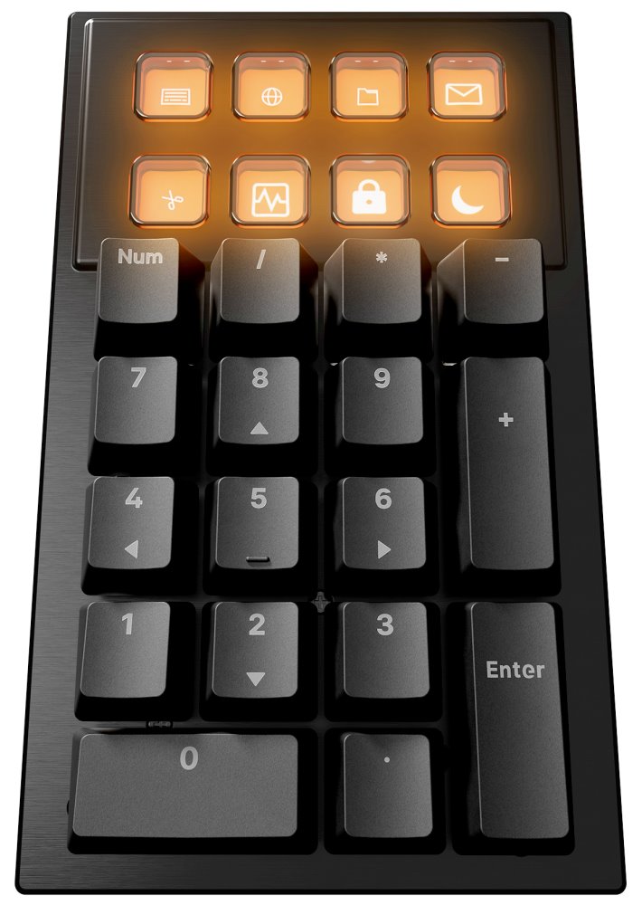 8 programovatelných kláves s displejem umožňuje zobrazení vlastních obrázků nebo animací. ARGB podsvícení s difuzéry na každém spínači zajišťuje rovnoměrné osvětlení jednotlivých kláves s možností nastavení atmosférických efektů.