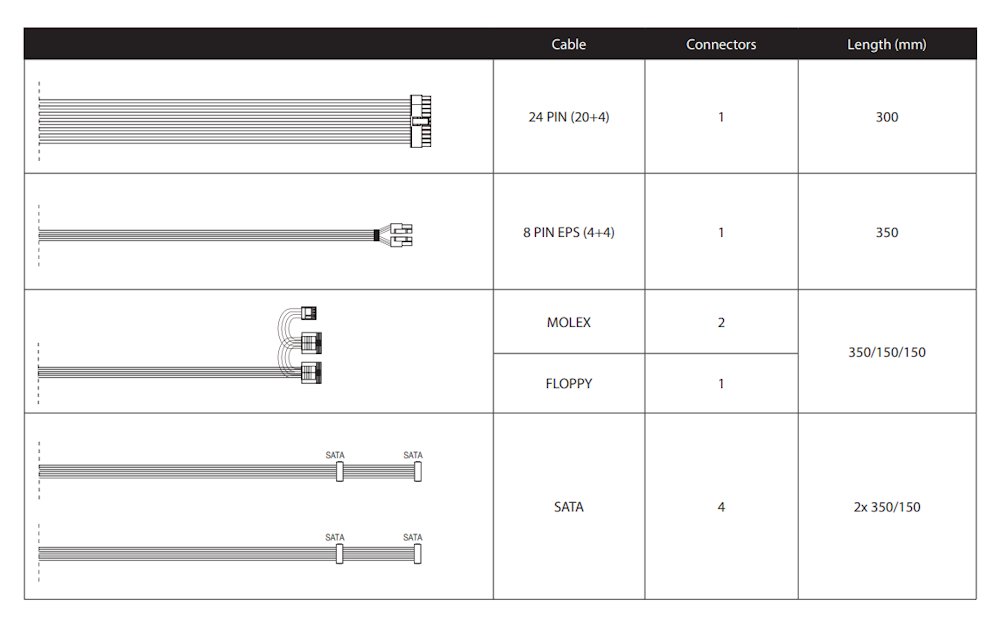 I přes kompaktní rozměry nabízí zdroj Chieftec GPF-300P dostatek konektorů pro všechny běžné komponenty. Součástí je 24pinový (20+4) konektor pro základní desku, 8pinový (4+4) EPS konektor pro napájení CPU, 2 konektory MOLEX, 1 FLOPPY konektor a 4 SATA konektory pro připojení pevných disků a optických mechanik.