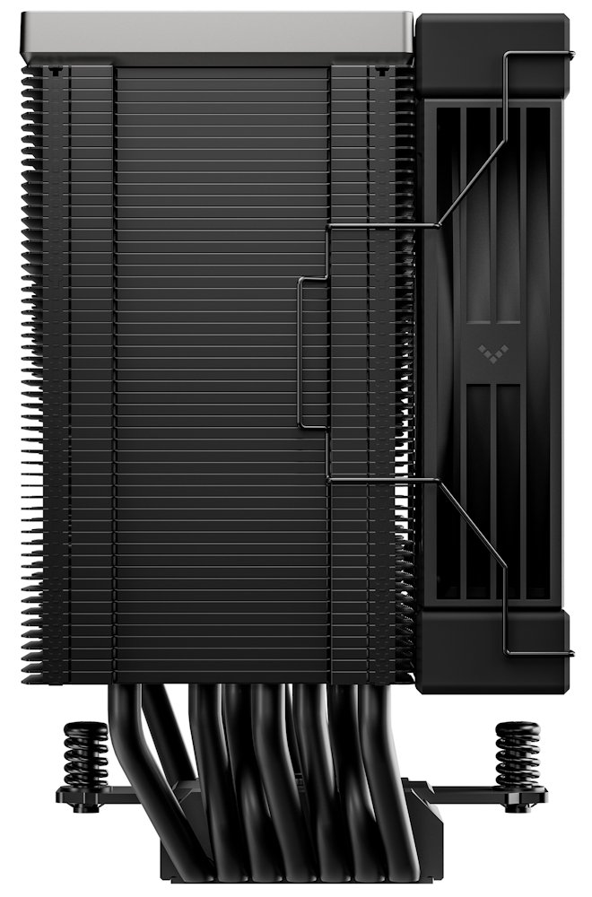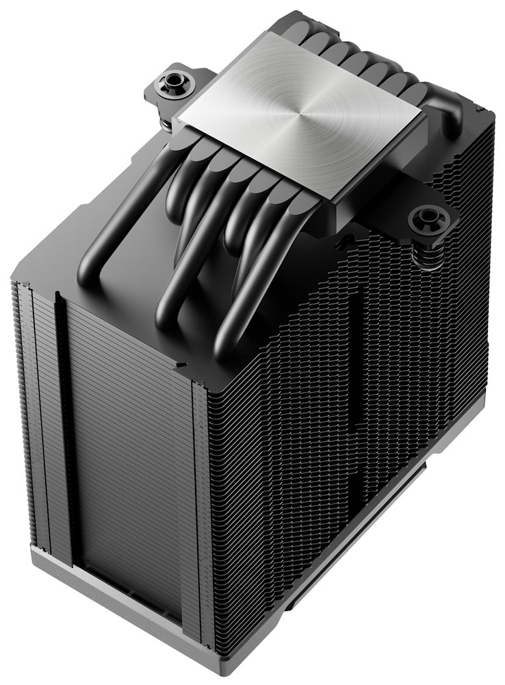 Věžový chladič s maticovým uspořádáním lamel o rozměrech 151 × 124 × 76 mm poskytuje velkou chladicí plochu při zachování kompaktních rozměrů. Precizně obráběná měděná základna zajišťuje rovnoměrný přenos tepla na všech sedm tepelných trubic. Celková hmotnost chladiče činí 1252 g.