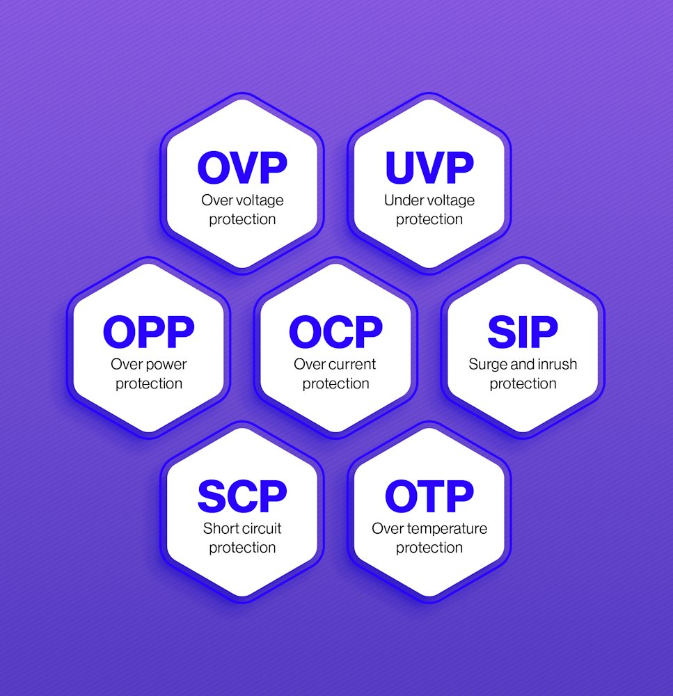 Zdroj obsahuje kompletní sadu elektrických a tepelných ochran včetně ochrany proti přetížení (OVP), podpětí (UVP), nadproudu (OCP), zkratu (SCP), přetížení (OPP), zapínacímu proudu (SIP) a přehřátí (OTP). Tyto prvky zajišťují maximální bezpečnost připojených komponentů.