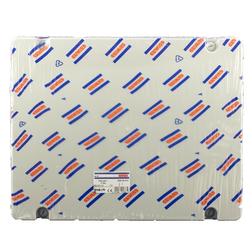 Jedná se o bezhalogenovou vodotěsnou montážní krabici s označením Gewiss GW44210 a montáží na zeď. Vnitřní rozměry jsou 380 x 300 x 120 mm, stupeň krytí IP56.