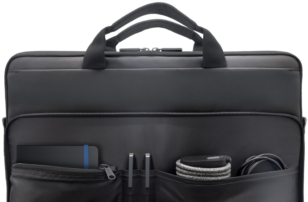 Brašna disponuje vyhrazenou polstrovanou přihrádkou s jemným sametovým povrchem a bezpečnostním popruhem, která chrání notebook před nárazy a poškrábáním. Díky několika kapsám a organizérům máte vždy po ruce vše potřebné – adaptéry, dokumenty, periferie i další drobnosti. Široká přední kapsa s dvojitým zipem se otevírá minimálně o 150 stupňů pro snadný přístup k obsahu.