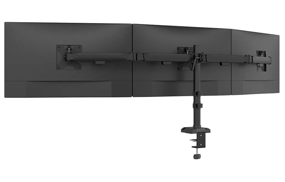 Plně pohyblivý stolní držák pro tři ploché monitory s úhlopříčkou 10" až 27" a maximální hmotností 18 kg (3× 6 kg). Všestranná technologie naklápění, otáčení a rotace umožňuje vytvořit optimální pozorovací úhel. Držák má nastavitelnou výšku 14 až 40 cm, hloubku 13,7 až 60,1 cm a je vhodný pro obrazovky, které odpovídají vzoru otvorů VESA 75 × 75 až 100 × 100 mm. Potěší také systém pro úhledné vedení kabelů. Balení obsahuje stolní svorku i průchodku. Na základně držáku se nachází praktický držák telefonu.