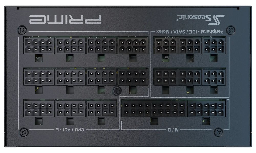 Konektory: 1× 24pin ATX, 3× EPS/ATX 12 V, 2× 12VHPWR (12+4pin), 8× PCIe (8pin), 10× SATA, 3× Molex