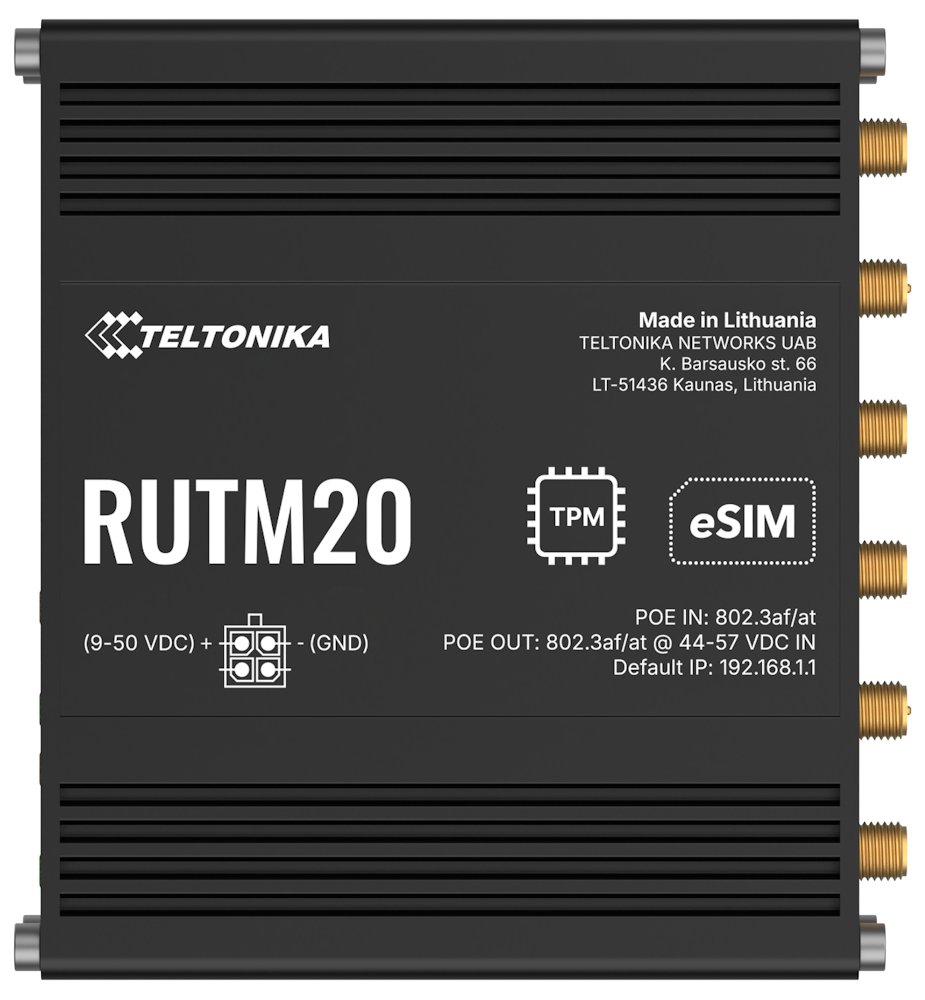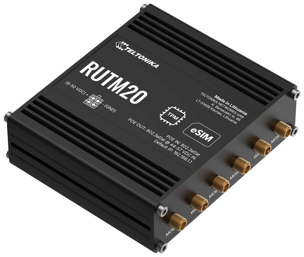 RUTM20 je ultra-kompaktní průmyslový 5G router navržený pro IoT a IIoT řešení, kde záleží na velikosti a nákladech. Využívá globální Telit 5G modem podporující 5G Sub-6GHz SA/NSA s rychlostmi až 2,5/3,4 Gbps DL (4×4 MIMO) a 900/550 Mbps UL (2×2), LTE Cat 19 (1,6 Gbps DL) a 3G (42 Mbps DL). Router je vybaven 2× fyzickými SIM sloty (Mini SIM 2FF) a 1× eSIM s podporou až 7 profilů, což umožňuje vzdálené přepínání operátorů bez nutnosti fyzického zásahu.