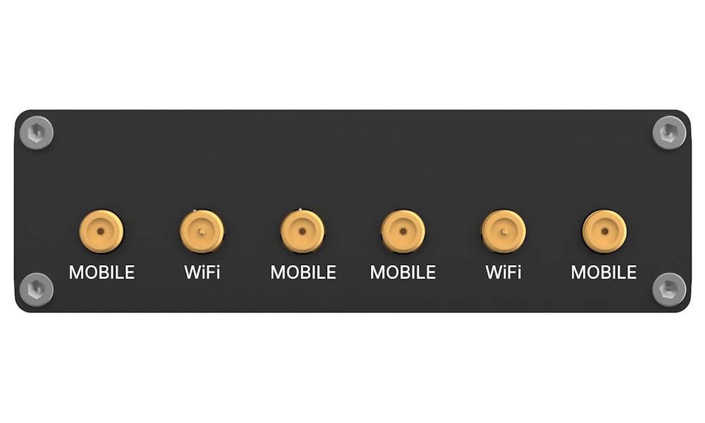 Anténní konektory: 4× SMA (mobilní), 2× RP-SMA (Wi-Fi)