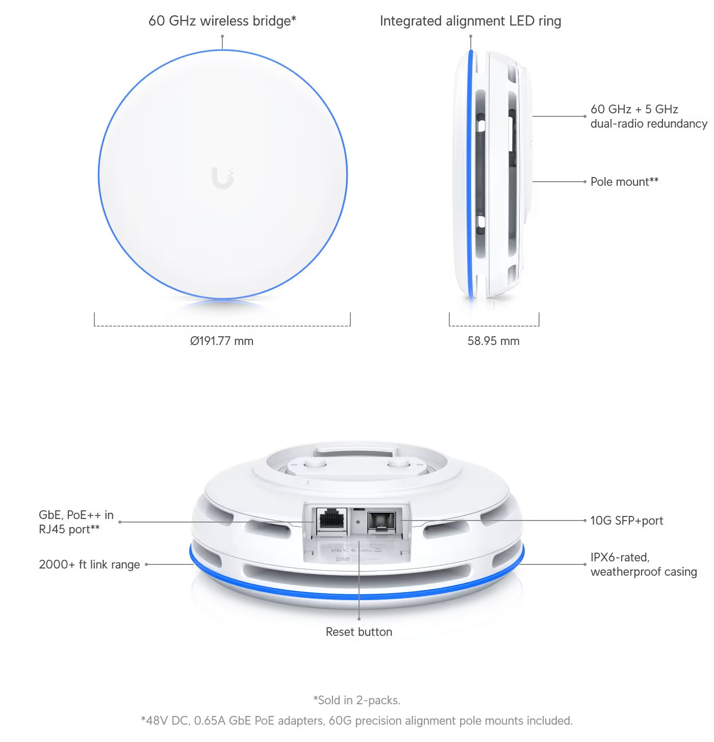 UniFi Building-to-Building Bridge XG 60GHz bezdrátový most s rozhraním 10Gb/s SFP+ Zařízení je vybaveno Gigabitovým LAN portem s podporou PoE, jedním SFP+ portem a Bluetooth pro jednoduché nastavení přes UniFi Network app z mobilu. * centrálně sprav...Více info