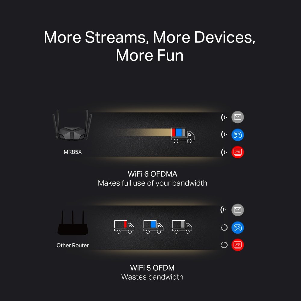 S dvoupásmovým Wi-Fi 6 routerem MR85X AX3000 od TP-Link rozšíříte pokrytí a zvýšíte rychlost a kapacitu připojení. Technologie Smart Connect automaticky vybere to nejlepší pásmo pro každé zařízení. Rychlosti Wi-Fi 6 dosahují až 3 Gbit/s, takže dokončíte stahování velkých souborů během několika minut. Zároveň streamujete obsahy v kvalitě 4K bez prodlev a přerušování. K dispozici máte 1x 2,5gigabitový WAN port a 3x gigabitový LAN port pro kvalitní a spolehlivé kabelové připojení.