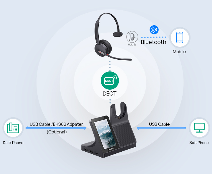Sluchátka Yealink WH64 integrují režimy DECT a Bluetooth, což umožňuje flexibilní přepínání signálu bez základny. Ať už jste v rušné kanceláři nebo pracujete na dálku, tato sluchátka zajišťují jasné a profesionální konverzace.