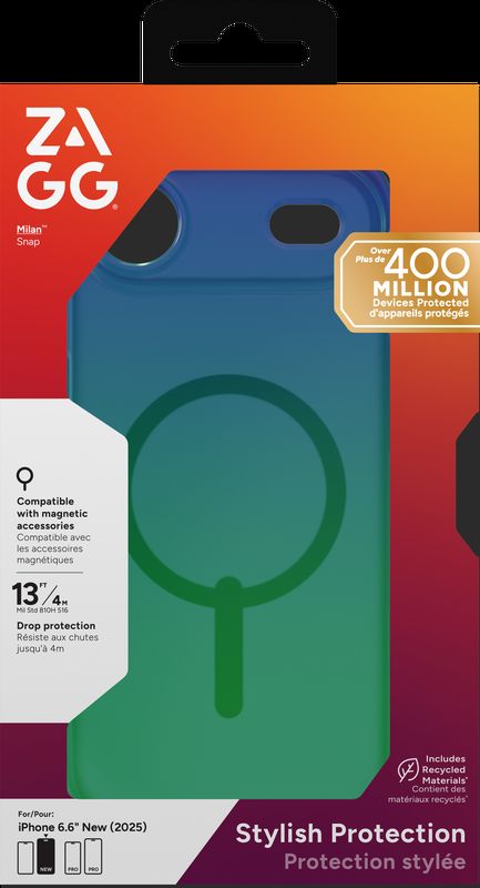 Ochrana při pádech z výšky až 4 metrů Kryt Milan Snap vaše zařízení ochrání při pádech z výšky až 4 metrů. Zesílen grafenem Kryt Milan Snap byl zesílen grafenem, jedním z nejsilnějších známých materiálů na Zemi. Grafen je materiál, který je tvrdší než diamant, pružnější než guma a přibližně 200× pevnější než ocel. Grafen je vysoce vodivý, díky čemu umožňuje odvod tepla. Tento materiál je využíván v letectví, kosmonautice, při výrobě profesionálního sportovního a vojenského vybavení atd. Štíhlé provedení I přes vysoký stupeň ochrany, který kryt zařízení nabízí, nepřidává Milan Snap zařízení zbytečně na objemu. Vyroben z recyklovaných materiálů Společnost ZAGG se snaží jít cestou udržitelnosti, proto je ochranný kryt vyroben až ze 74 % recyklovaných materiálů. Kompatibilita s MagSafe Kryt je kompatibilní s MagSafe a s většinou bezdrátových nabíječek. Antimikrobiální složka Milan Snap disponuje antimikrobiální složkou, která jej chrání před bakteriemi způsobujícími degradaci materiálu a zápach.